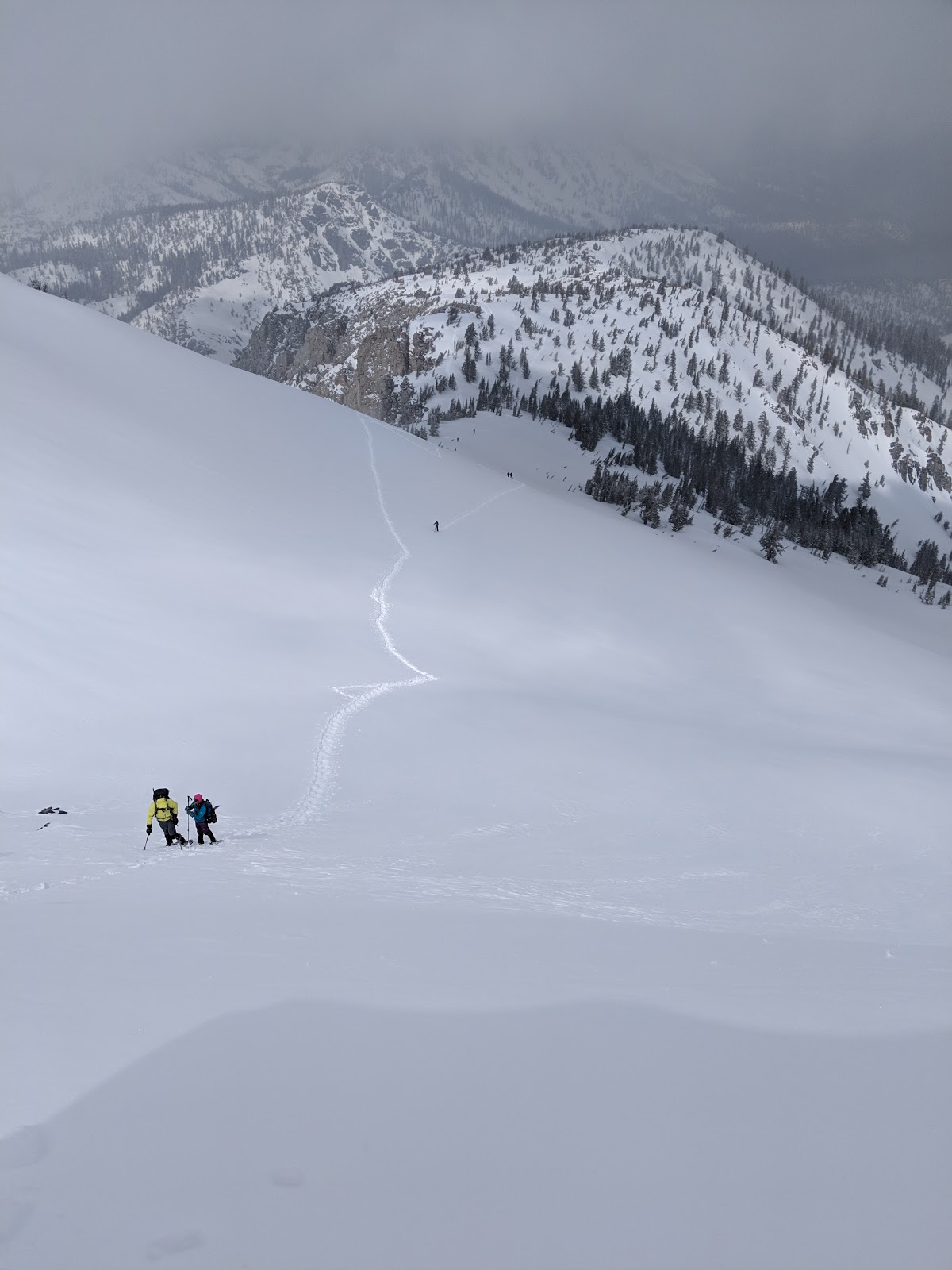 We head out on the summer highway which is easy to snow shoe through the ranger's shortcut to avoid any Avy danger. In about 2 hours we were at Helen lake which looks really beautiful in summer but in winter when frozen it looks even more mesmerizing! Chris suggested we tag Eagle peak and Ski Heil peak given how much time we had in our hands. So we dropped our bags at the edge of Helen lake and ran up to Eagle Peak. It took some route finding but was fairly easy to contour to the base of Eagle peak and then plow through a gentle slop to reach the peak. Descending Eagle peak was a little tricky as it involved descending a steep short gully which was made challenging due to the slushy afternoon snow conditions. Once at the bottom it was an easy hike to the summit of Ski Heil peak. Ski Heil is massive inverted bow. It has a flat top with gentle slopes all around. We ended up glissading down which was a lot of fun!